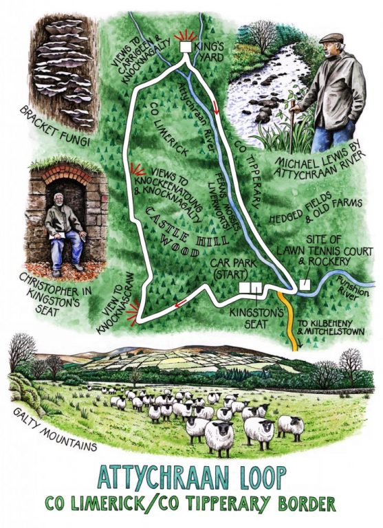 Road: M8 Jct 12; immediately right off N73 Mitchelstown road through Kilbeheny. Just beyond, left (brown ‘King’s Yard’ sign); right (‘National Looped Walk Trailhead’); left into Galty Castle Wood, to car park.