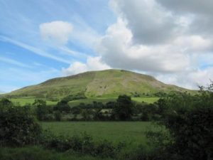 We drove the narrow hill road that winds up the south-west angle of Benbradagh and parked at the top of the lane. Benbradagh – Binn Bhradach, the Thief’s Mountain, no-one knows why – dominates Dungiven the way Benbulben dominates Sligo, a mighty presence at the back of the town, wedge-shaped and green as it hangs half-way up the sky. Grey slopes of bouldery scree tumble from its peak, contributing to the wild look and reputation of the mountain.