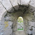 Tobar Éinne lay by the lane side, a beautifully kept holy well in a double curve of stone wall like a yin-yang symbol, the entrance marked by a weather-smoothed bullaun with a smidgeon of rainwater held in its hollow for a wish or blessing. The lane led us back to Cill Ghobnait on the outskirts of the village, a diminutive stone church, well over a thousand years old, with great thick walls and a tiny arched east window. Then we fumbled and wandered our way back to the south end of the island, with views widening over the waist-high stone walls, south-east to the abruptly stepped silhouette of the Cliffs of Moher, north to the crumpled blue backbone of the Maumturks and Twelve Bens against the smoking rain clouds over Connemara.