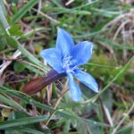 The back of Inisheer is divided into hundreds of tiny fields, each enclosed by walls of rough stone blades and boulders so intricately positioned that they look like artists’ installations – an effect enhanced by the chinks of white, grey, blue and silver sky caught like stained glass between the stones. In the fields we found watchful horned cattle, doleful piebald horses, and such a profusion of wild flowers it was hard to know where to look first – on this spring day, primroses, bluebells, milkwort, buttercups, cowslips, early purple (and white) orchids, and just-emerging flowers of bloody cranesbill of a deep, rich, episcopal pinky-purple. Pride of the place, though, were the spring gentians – royal blue trumpets raised skywards, of a colour so vivid and intense it always takes one by surprise, spring after spring.