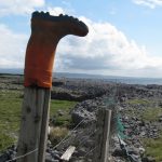 Nearer at hand, Inisheer’s lighthouse raised a black and white striped finger on the southern shore. White rollers were creaming in from an indigo sea to crash on the rim of the island. We followed the well-beaten path over the pebbles, accompanied by flights of oystercatchers with their plaintive p’cheep! of a call, towards the rusty old hulk of the freighter Plassey lying stranded for ever more on the storm beach of Inisheer’s most easterly point.