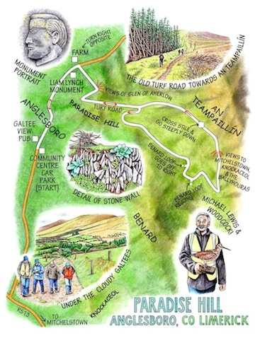 Michael knows, better than most, the farms and farmers, the laneways and hills of this north-west corner of the Galty Mountains. Jim has the same knowledge and feel for the neighbouring Ballyhoura hills. And Fergal is a new broom brought in to sweep some energy and imagination into the leisure activities of both mountain ranges, which saddle the borders of Limerick and Tipperary. Setting off up Paradise Hill with the three of them felt like a walk with a gathering of tutelary spirits.