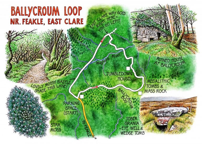 WALK: Follow forest road; in 1 km, left (‘Mass Rock’; East Clare Way yellow walking man and arrow/ECW; purple arrow/PA) out of trees, across Ballycroum bog. Follow ECW and PA past Mass Rock and megalithic tombs for 1 km. Right over stile (ECW/PA) out of bog; descend path; left (ECW/PA) down to road. Left for 200m; right (ECW/PA) down field edge; cross Maghera River by footbridge; up field edge into green lane. Left (ECW/PA) for 0.8 km. At tarred road by a farm ECW goes right, but turn left here (PA). Follow lane and Pas to recross Maghera River; steeply uphill on stony lane; at T-junction, left to car.