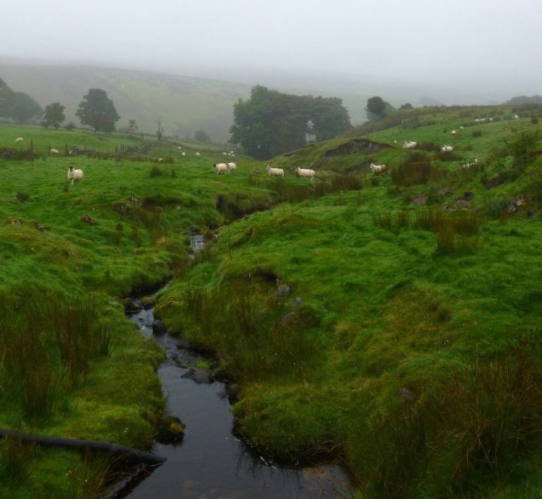 Along the road we walked from Cargan, cattle lay in the stone-walled fields, each cow preserving her own dry patch. We passed a rough-cut, square-topped standing stone half-hidden under an ornamental tree in a cottage garden, and turned along a lane that led past mountain farms towards Dungonnell Reservoir. Every farm gate held its black and white guardian collie, head cocked low and sideways, a picture of acute alertness and suspicion. Three magnificently horned sheep watched us across their field wall, stamping the grass and shaking mist-drops from their coats like dogs.