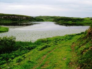 We called in to the excellent Boathouse visitor centre and island museum for a quick chat with Tom McDonnell and a look at his fabulous Rathlin photographs, then headed from the shore road past the shell of the kelp factory that once brought work and prosperity to the seaweed-processors of the island. Soon the harbour and buildings were behind us, and we strolled the up-and-down road past Craigmacagan and Kinkeel Loughs, beautiful sheets of still water fringed with reeds and paved with broad green lily pads.