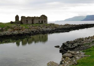 WALK DIRECTIONS: Turn right along harbour past Boathouse Visitor Centre. Fork right past Kelp House ruin along shore road. At T-junction, right along main island road for 2.8 km (1¾ miles) to end of road at Ushet Port. Returning, in 200 m turn left through gate into RSPB Roonivoolin reserve. Left along fence, following ‘Roonivoolin Walk,’ ‘Coastal Walk’ and black/orange arrows. Optional path outside fence, reached by stiles – NB – unguarded cliff edges! Where fence ends at cliff, right inland along fence (arrows). Descend into valley between telegraph poles, aiming for waymark post on saddle of ground. Follow waymarks and grassy track, keeping Ushet Lough on right, to reach road. Left to harbour.