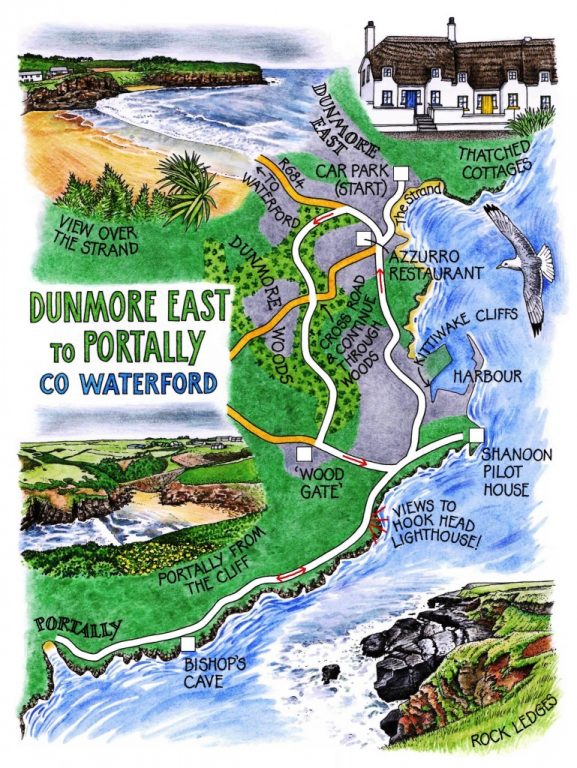 WALK DIRECTIONS: Up shore road from The Strand. Near top, right up steps; cross road (‘Woods Walk’)’ woodland path opposite. At top of climb, left at T-junction of paths. Cross one road, on through woods; at next road, left opposite ‘Wood Gate’ towards sea. On left bend, cross road; right along coast path (‘Coast Walk’) for 1½ miles to Portally. Return along cliffs to Dunmore East.