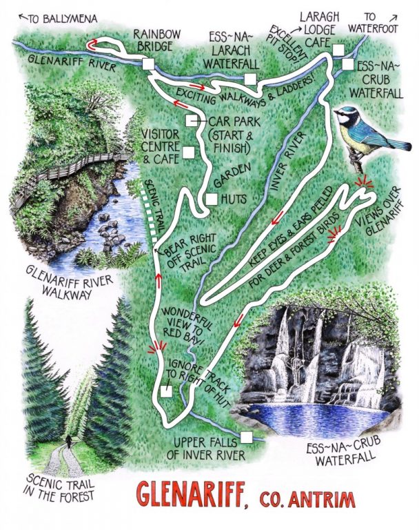 WALK DIRECTIONS: From Glenariff Forest Park car park, follow Waterfall Walk/WW signs. At foot of slope, by WW signboard, bear left down path to cross Rainbow Bridge. Track soon doubles back to re-cross bridge and continue along WW. Follow WW to Laragh Lodge tea room.