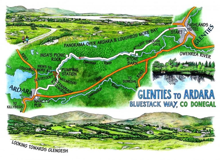 WALK DIRECTIONS: Bluestack Way (BW) is signposted off Glenties main street opposite Limelight Niteclub. Follow minor road (Clós Naomh Chonaill) out of town (BW, yellow ‘walking man’ symbols and yellow arrows; brown ‘Ardara’ signs). At T-junction, left along road. In 2 km/1⅓ miles, left through gate (BW) down stony track between fields. In 200 m, right opposite stone barn (BW) along left bank of ditch. In 150m cross Owenea River; follow BW along left bank. In 1 km (0.6 miles) recross river, follow BW along right bank. In 4 km/2½ miles approx., recross at small pumping station; follow rough tarmac road to R261; left into Ardara.