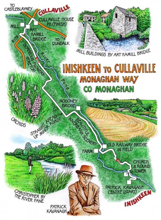 WALK DIRECTIONS: From Patrick Kavanagh Centre, right along road. In 150 m, cross road and go left along River Fane path (‘Monaghan Way’/MW) to river bridge. Cross bridge; on along road under railway bridge; round bend. Left (MW); up field slope by hedge, over stile, right up boreen (MW). In 200 m, left over stile (MW); ahead over crest, down slope to old railway (MW); right along railway track. In a few hundred metres, right (MW) beside game pen; up field to lane, left to road. Left (MW). In 200 m, right (MW) over river, up farm drive. In 20m, right (MW) through wicket gate. Aim for stile in far hedge, then for bridge ahead. Left here through fields by river (MW, stiles) for 1⅓ miles/2 km to Mogoney Bridge. Left along road (MW). In 400 m, right at crossroads (MW). In ½ mile (0.8 km) at left bend, keep ahead up minor road (MW). In ⅓ mile (0.5 km), right up boreen (MW). At end, over stile (MW), up field slope to stile onto old railway (MW). Left and follow railway for 1½ miles (2.3 km) to bridge over R179. On for 100 m; right down slip road; left along R179 to Cullaville.