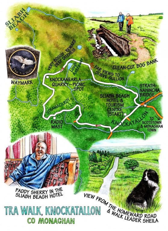 A true word. Sheila proved an excellent leader, guiding us unerringly across the squashy southern skirts of Sliabh Beagh, the low mountain of damp blanket bogs and hollows that rises where three counties meet – Fermanagh, Tyrone, and Monaghan where the Tra Walk is set. Sheila had little to say for herself. The same couldn’t be said of Paddy Sherry, a man who rejoices in introducing walkers to the hidden crannies of his native country, and isn’t afraid to share its myths, geology, history and wildlife delights with all comers. Paddy and others in the local community work like Trojans to bring life and a bit of prosperity to their often disregarded area – everything from building their own Sliabh Beagh Hotel and Tourism Centre (the hub of the community hereabouts) to laying out a whole system of country walks.